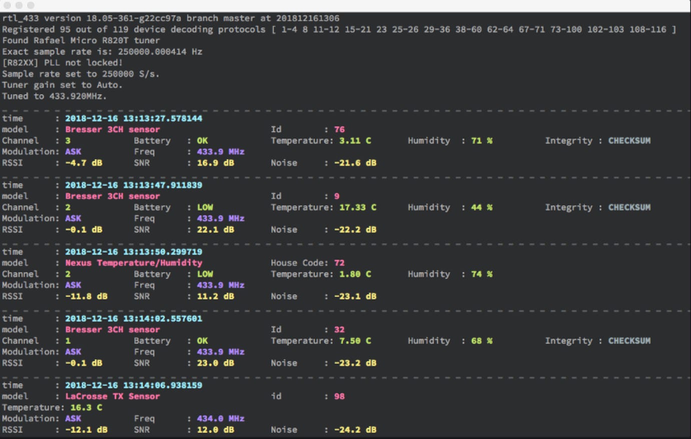 If you’ve got said messages, then that's it! You’re ready to go, and any ISM signals within range should be displayed in your terminal thanks to your RTL-SDR.