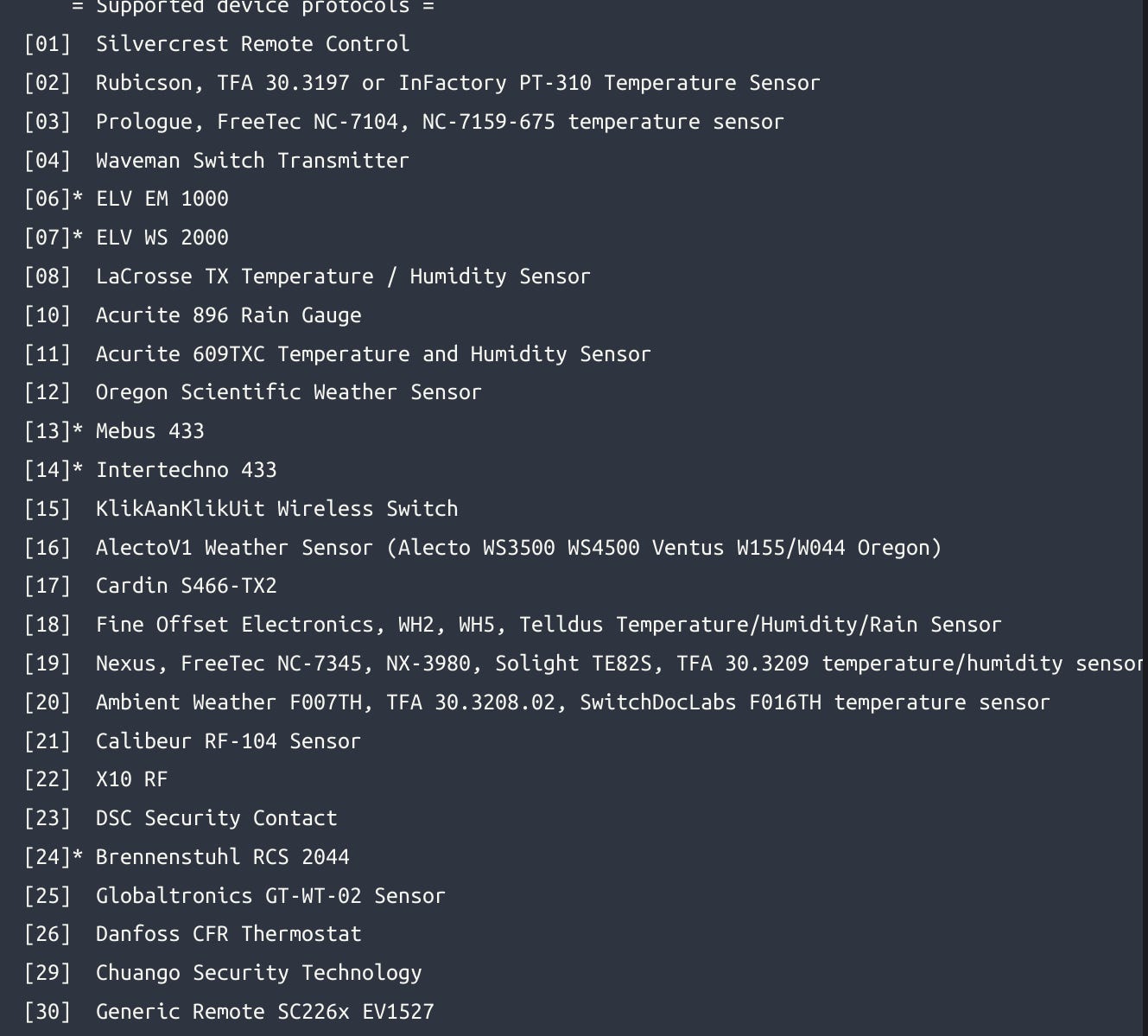 Well, as it happens, quite a lot actually. A quick look at the notes to find supported protocols shows more than a few interesting vendors there. Needless to say, weather stations, temperature sensors and rain gauges are just some of the devices that you’ll find as supported protocols. Look a little harder, and you’ll also find LORA, Home Automation devices and possibly even some remote controls of different types. There are, in fact, over 200 protocols listed as compatible in the RTL-433 documents, so there’s plenty there to keep you amused.